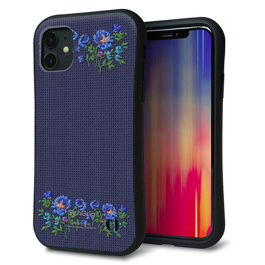 iPhone11 スマホケース 「SEA Grip」 グリップケース Sライン 【KM944 花刺繍風 ブルーフラワー オフホワイト 】 UV印刷