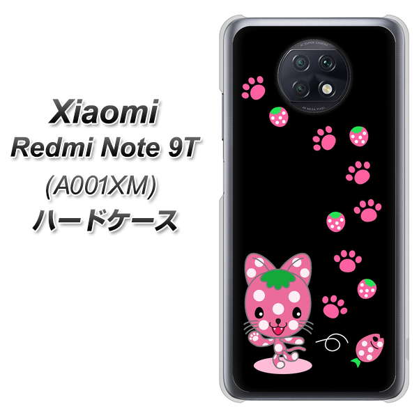 SoftBank Xiaomi(シャオミ)Redmi Note 9T A001XM 高画質仕上げ 背面印刷 ハードケース【AG820 イチゴ猫のにゃんベリー(黒)】