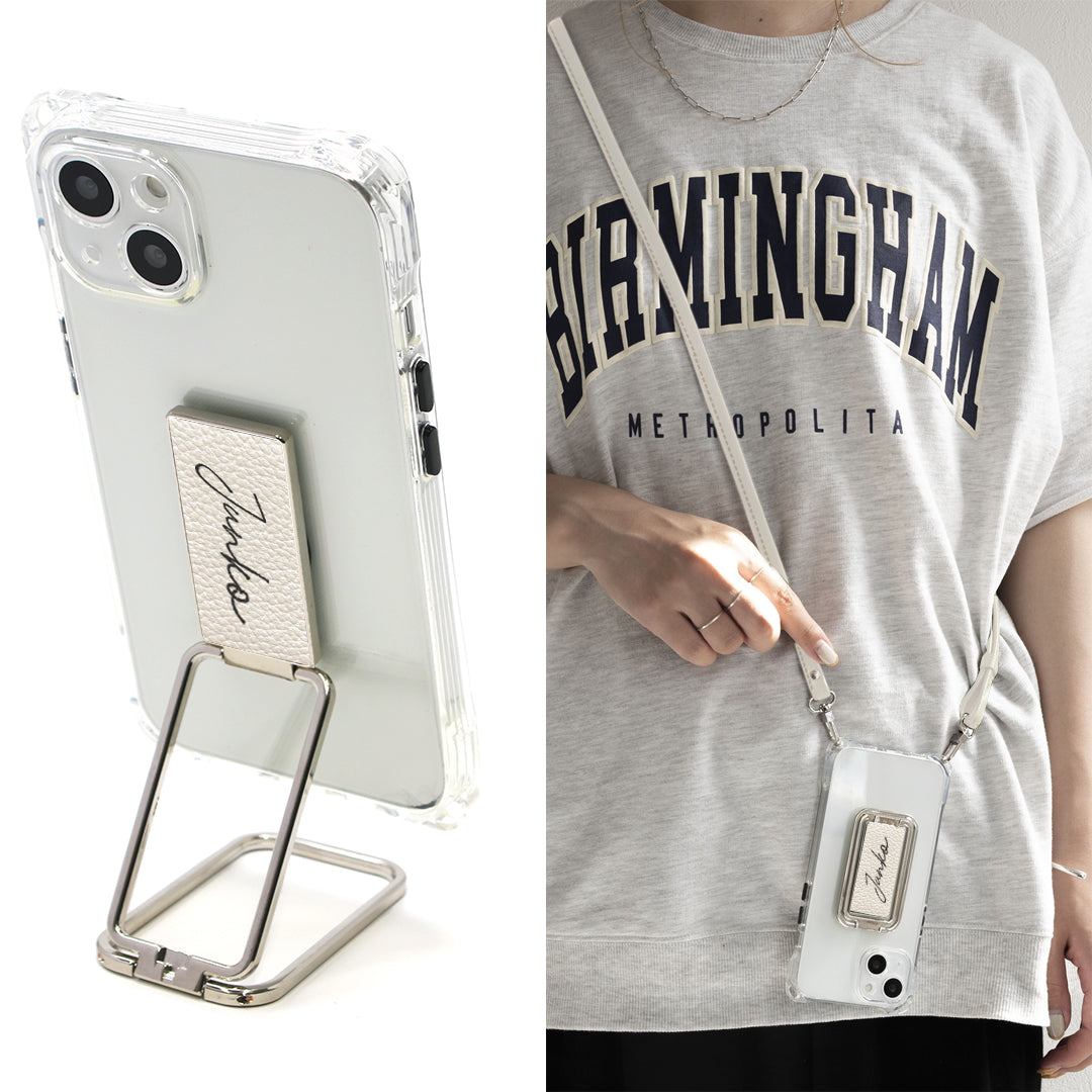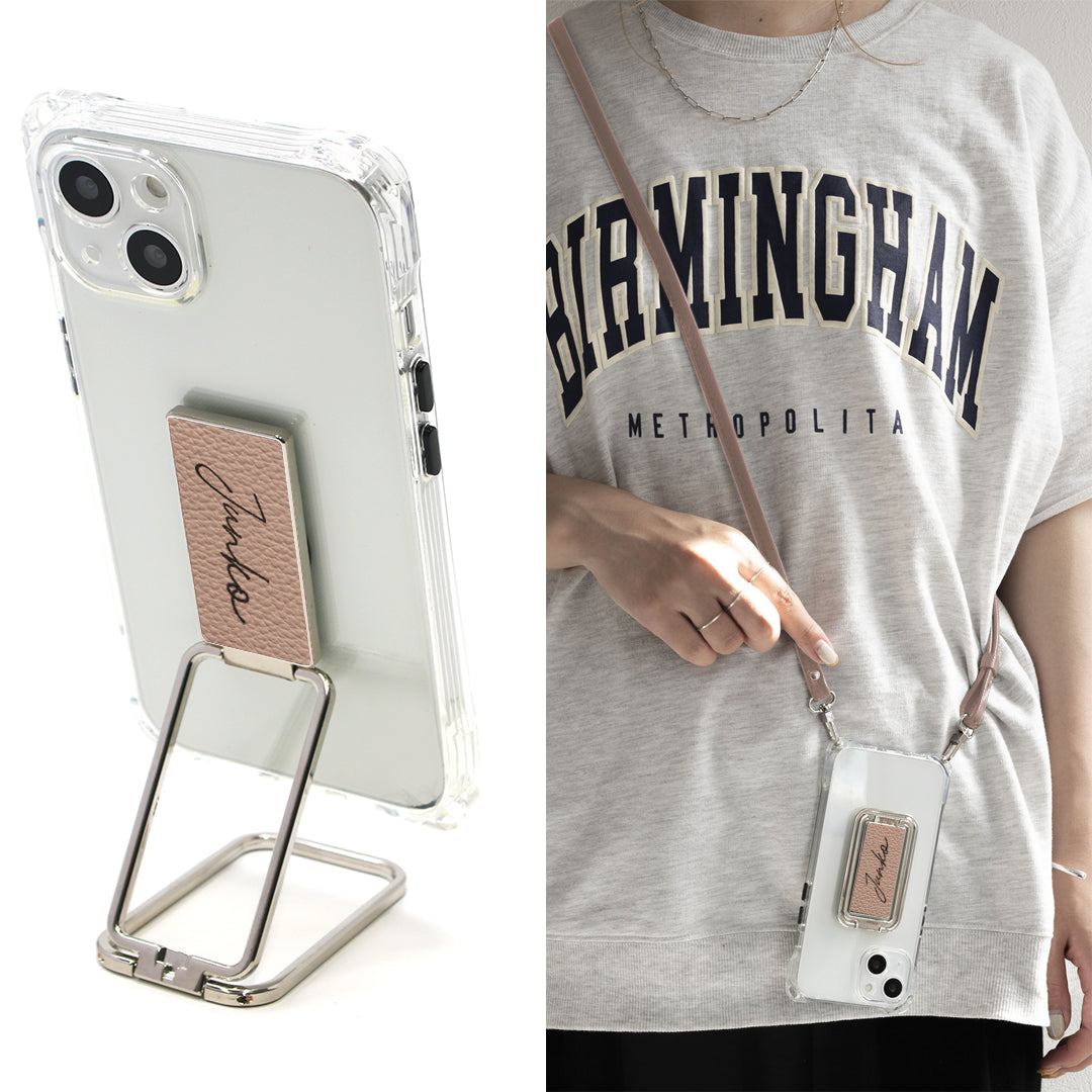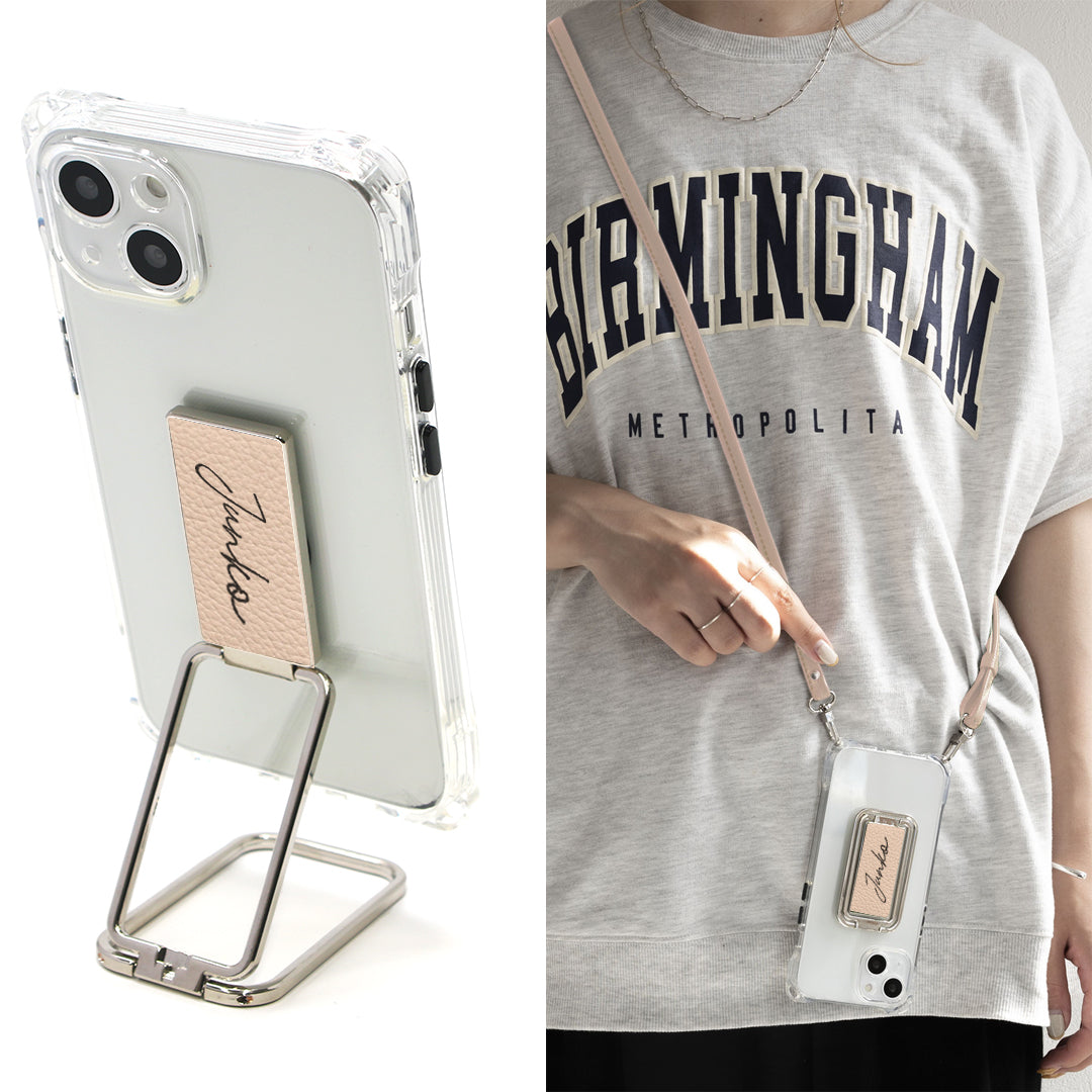 iPhone13 スマホスタンドになる名入れ多機能リング&透明クリアケース ストラップ付き