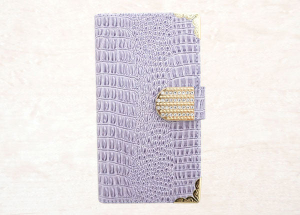 キラキラのラインストーンバックル+クロコダイル柄が人気の大人かわいい手帳型ケースです。加工手順が多いため他の商品より納期がかかります。