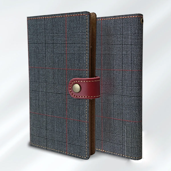 シックなグレンチェックと深みあるイタリアンレザーのボタンベルトの組み合わせで大人可愛く仕上げた手帳型ケースです。