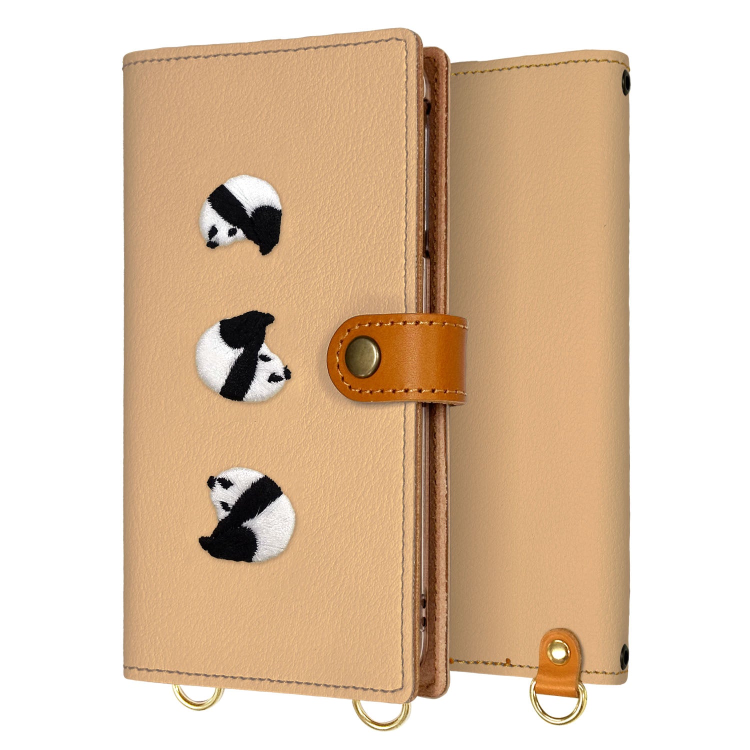 可愛いパンダたちを刺繍した手帳型のスマホケースです。