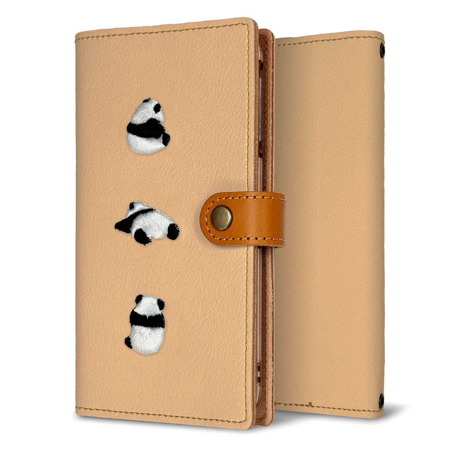 可愛いパンダたちを刺繍した手帳型のスマホケースです。