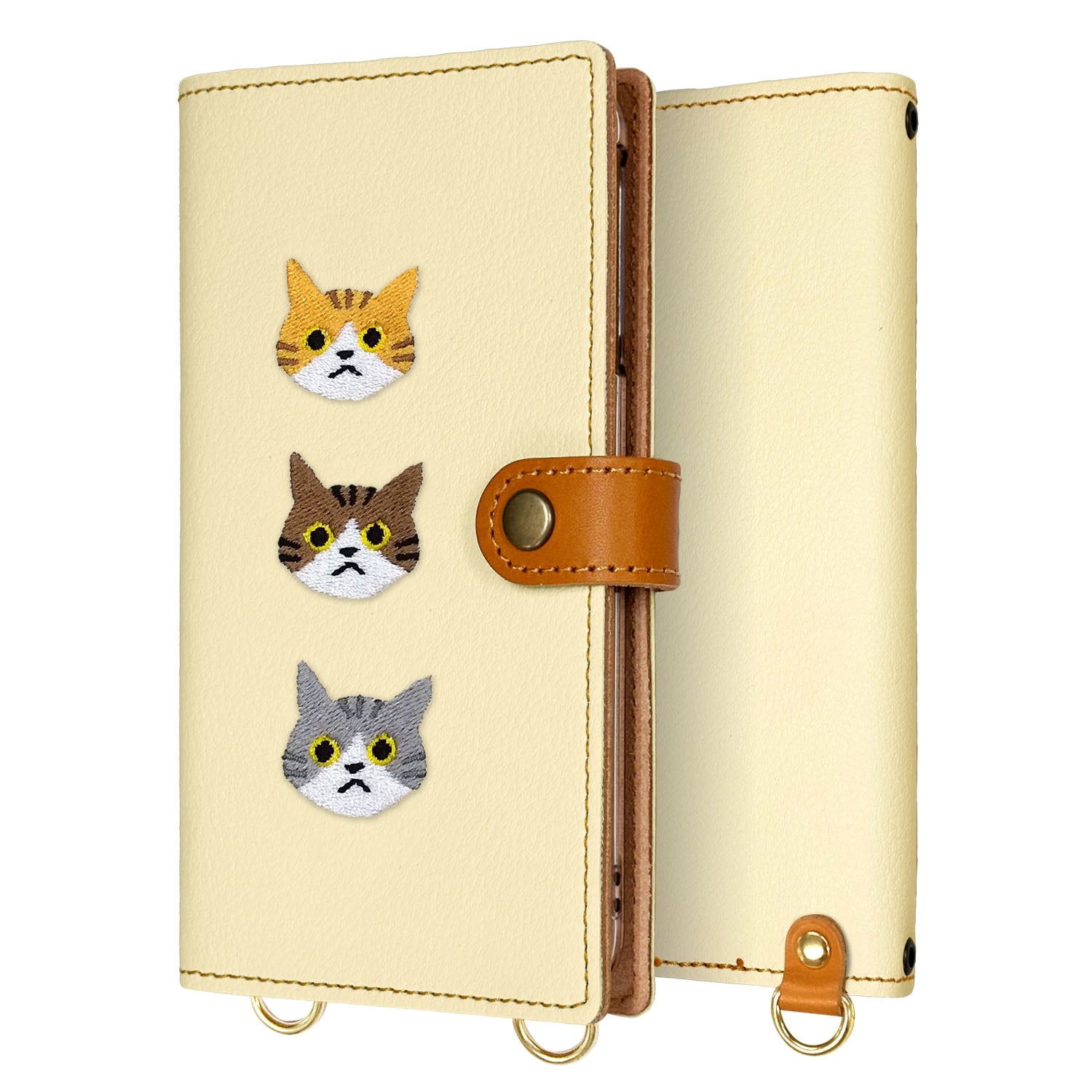 3匹の猫を刺繍した猫好きさんにおすすめの手帳型のスマホケースです。