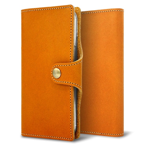 栃木レザーを贅沢に使っています。マグネットボタンで開閉するベルト一体型の手帳型ケースです。