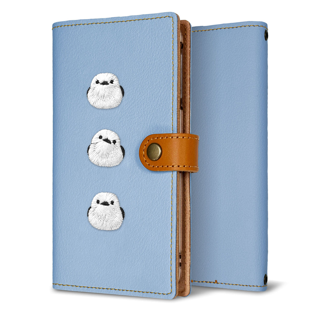 3羽のシマエナガの刺繍を施した手帳型スマホケース。