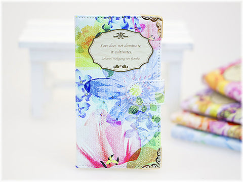 ヴィンテージ感あるエレガントなカラーリングに加え、ケースの四隅に控えめゴージャスなパーツをあしらって、さりげないおしゃれが楽しめます。中央のエンブレムプリント部分はは、ゲーテの有名な恋愛名言となっています。