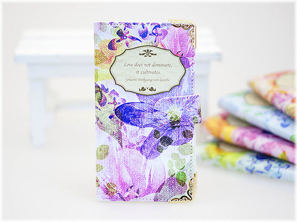 ヴィンテージ感あるエレガントなカラーリングに加え、ケースの四隅に控えめゴージャスなパーツをあしらって、さりげないおしゃれが楽しめます。中央のエンブレムプリント部分はは、ゲーテの有名な恋愛名言となっています。