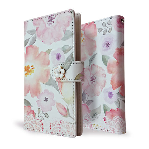 やわらかでやさしい花柄スマホケース。押し花風のプリントデザインに、レースのプリントという上品なデザインとカラーリング。当店定番のプリントケースにデコをあしらった手帳ケースです。