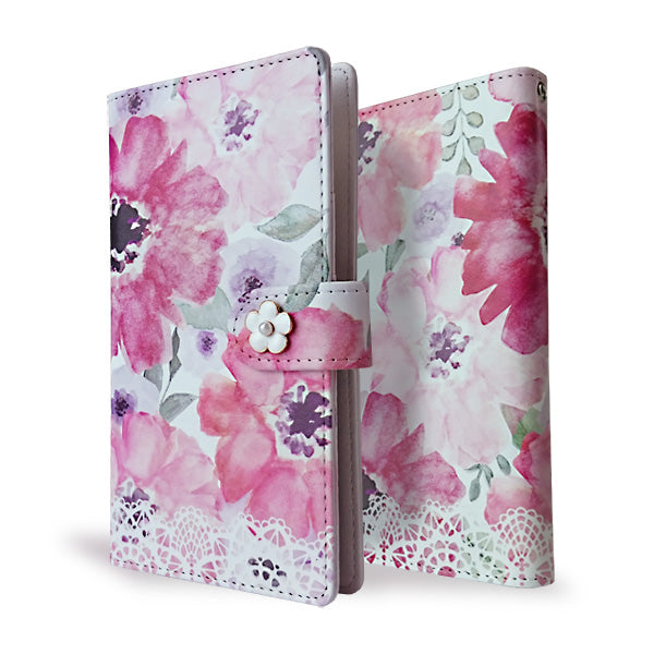 やわらかでやさしい花柄スマホケース。押し花風のプリントデザインに、レースのプリントという上品なデザインとカラーリング。当店定番のプリントケースにデコをあしらった手帳ケースです。