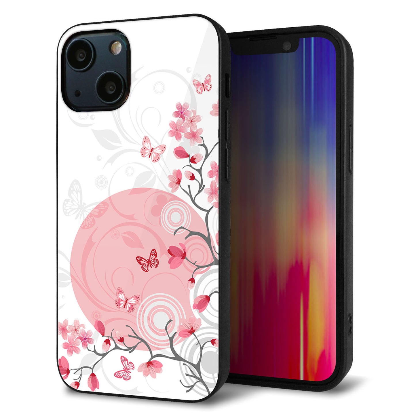 iPhone13 mini 強化ガラス&TPUスマホケース ガラプリ【030 花と蝶(うす桃色)】