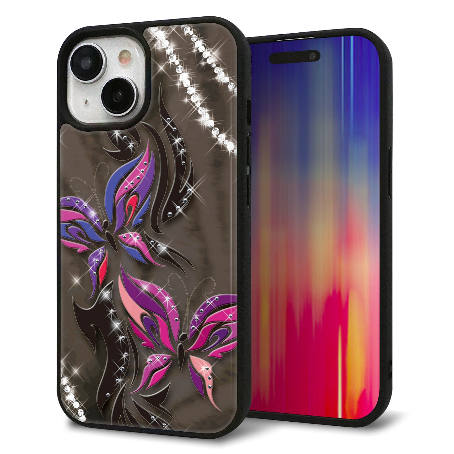 iPhone15 強化ガラス&TPUスマホケース ガラプリ【1164 キラめくストーンと蝶】