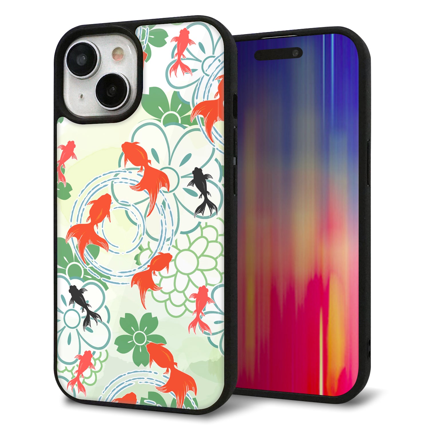 iPhone15 強化ガラス&TPUスマホケース ガラプリ【HA218 金魚 花柄 グリーン】