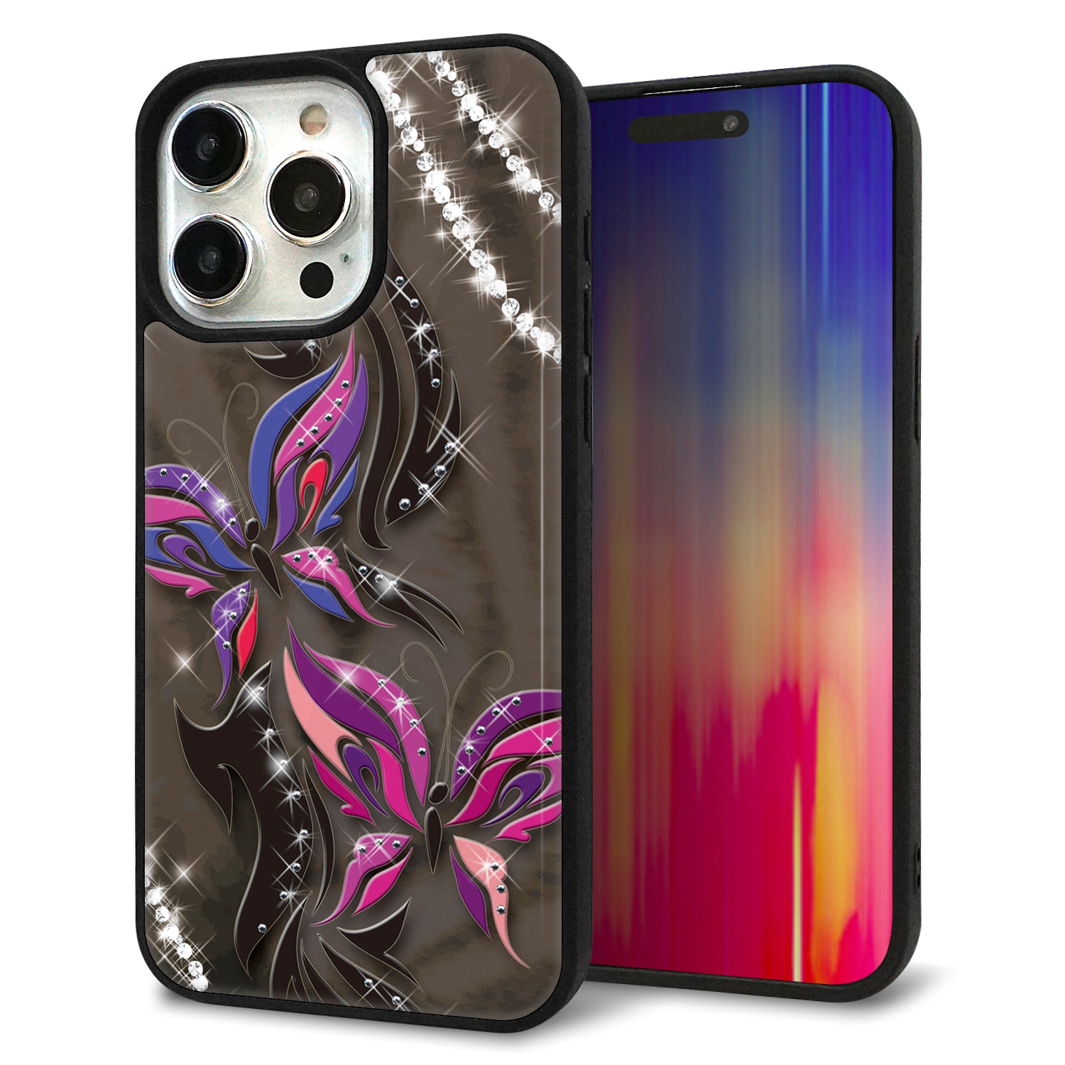 iPhone15 Pro Max 強化ガラス&TPUスマホケース ガラプリ【1164 キラめくストーンと蝶】