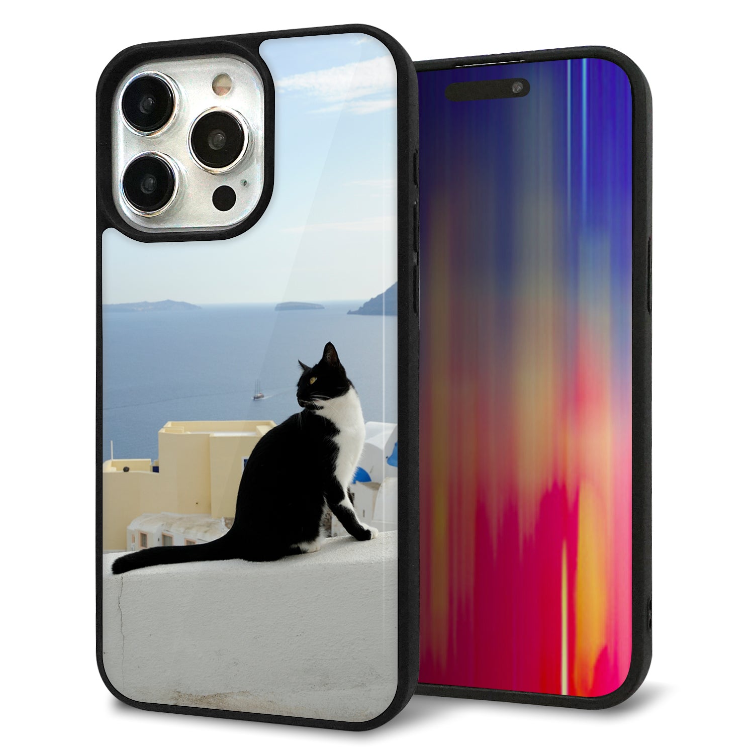 iPhone15 Pro Max 強化ガラス&TPUスマホケース ガラプリ【VA805 ネコと地中海】