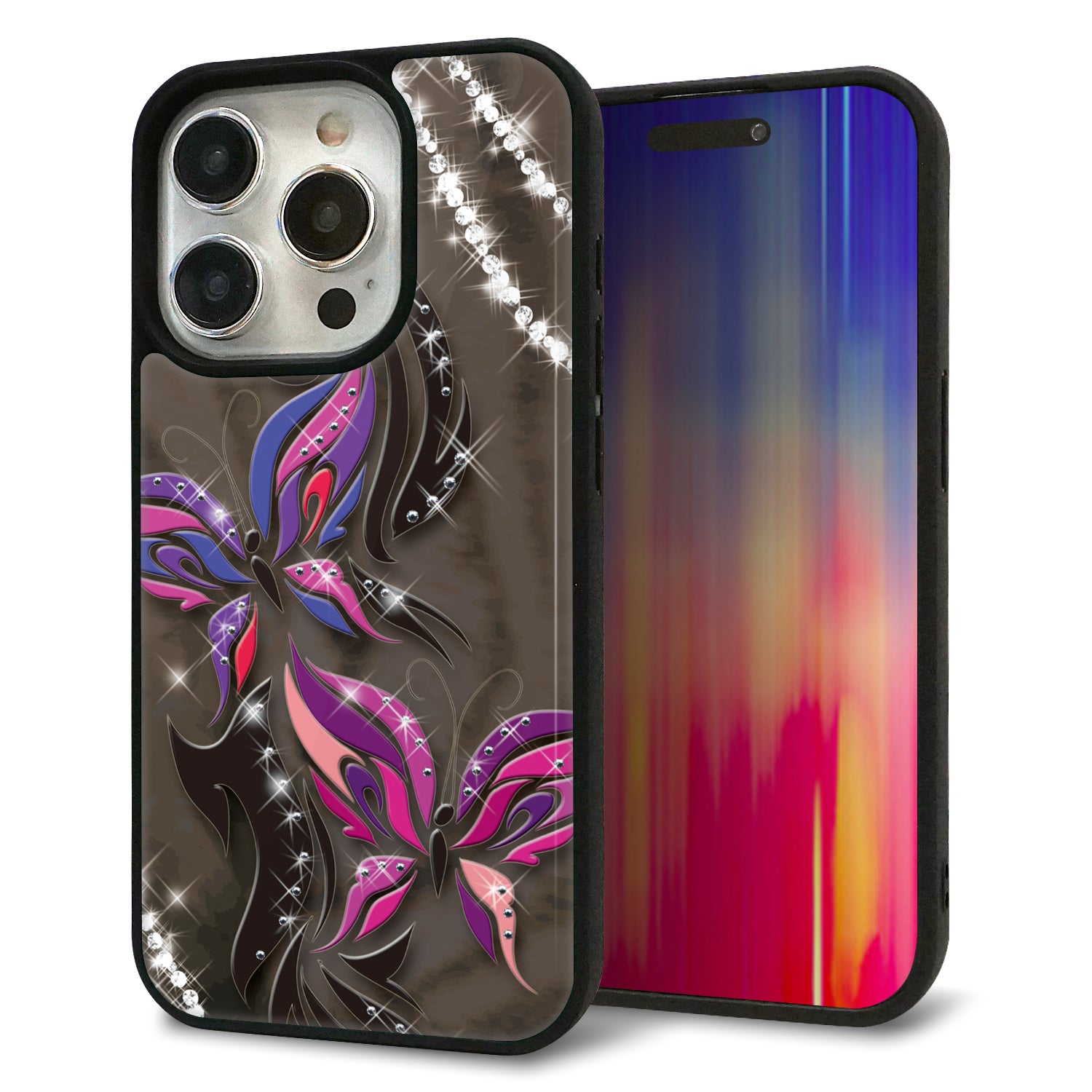 iPhone15 Pro 強化ガラス&TPUスマホケース ガラプリ【1164 キラめくストーンと蝶】