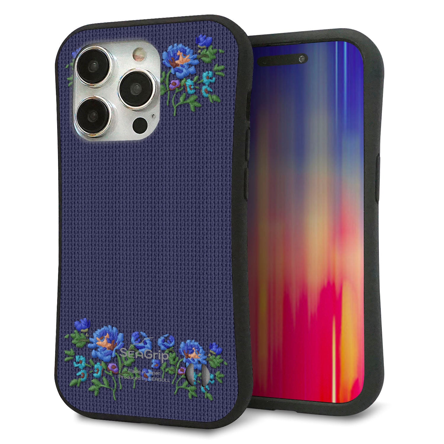 iPhone15 Pro スマホケース 「SEA Grip」 グリップケース Sライン 【KM944 花刺繍風 ブルーフラワー オフホワイト 】 UV印刷