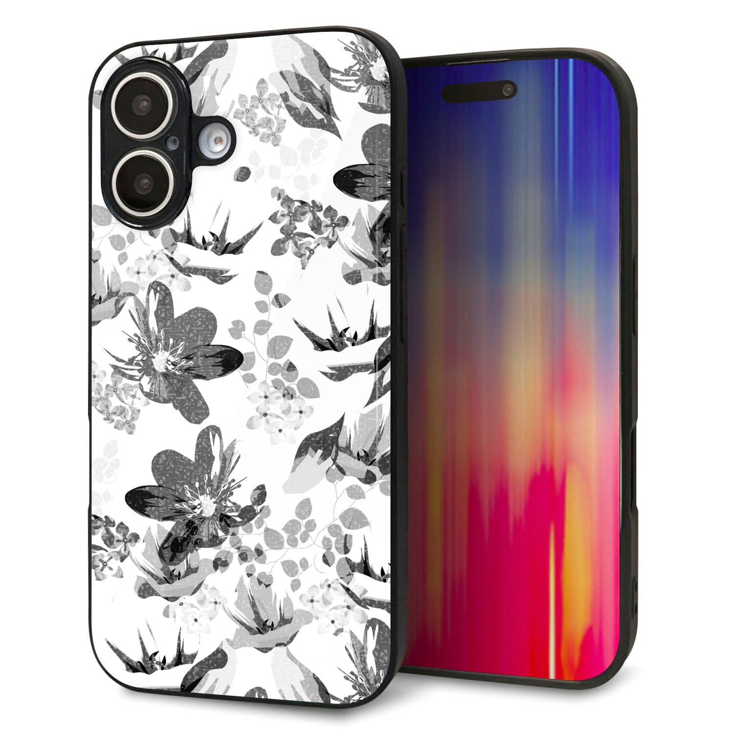 iPhone16 強化ガラス&TPUスマホケース ガラプリ【SC914 花柄モノトーン 03】