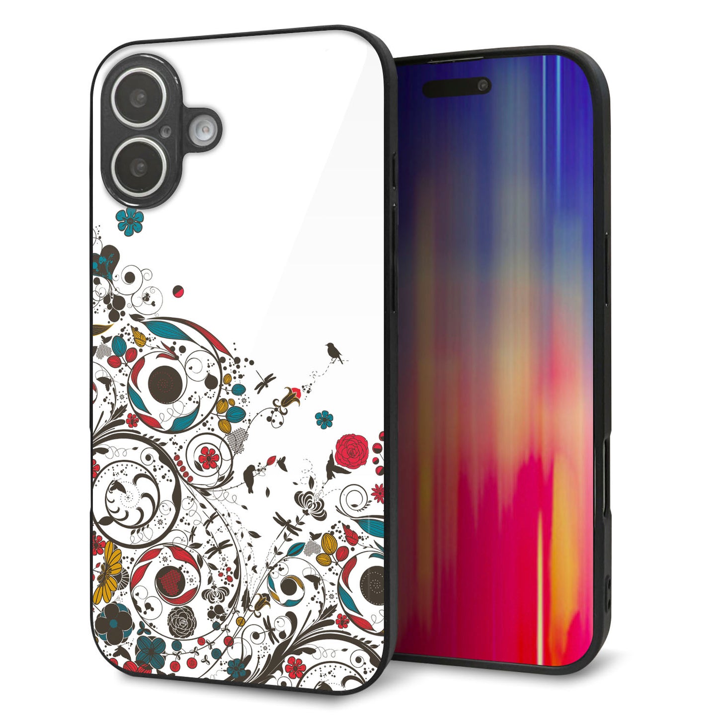 iPhone16 Plus 強化ガラス&TPUスマホケース ガラプリ【EK908 カラフルな花と鳥】