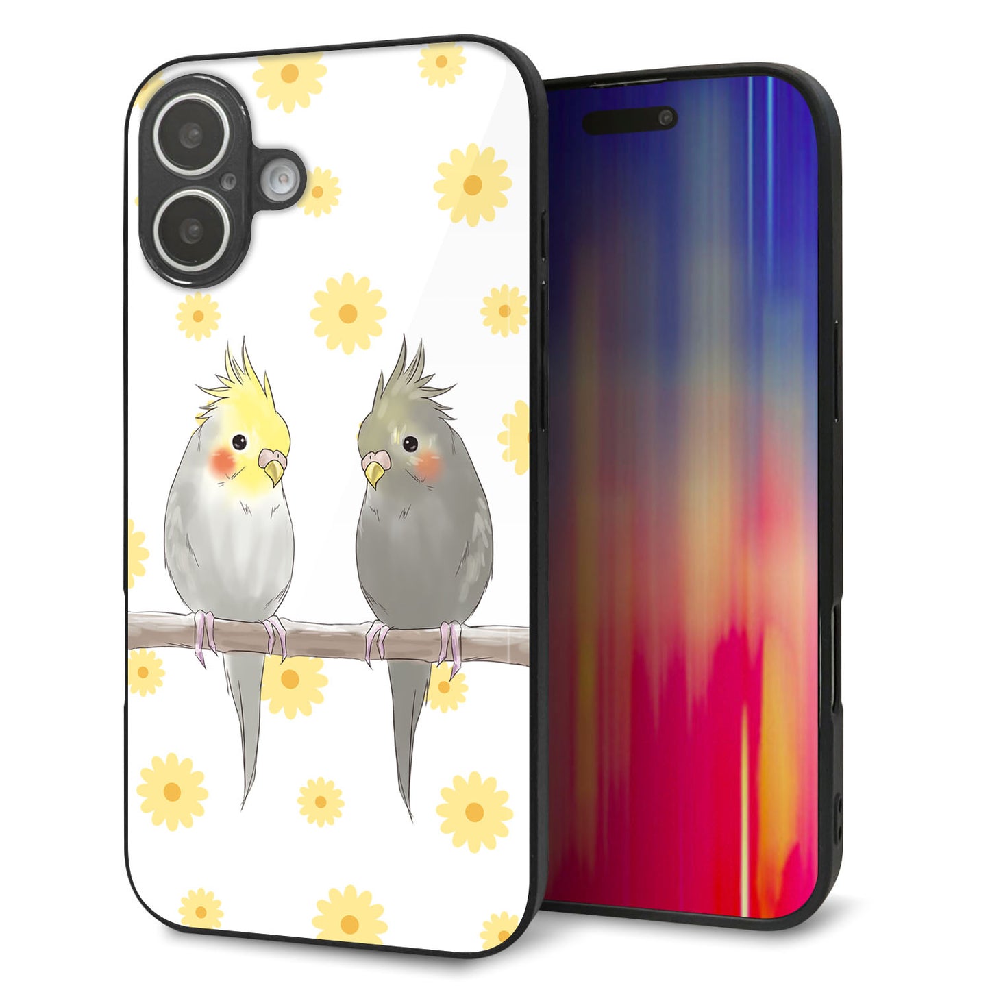 iPhone16 Plus 強化ガラス&TPUスマホケース ガラプリ【HA274 オカメインコ 花】