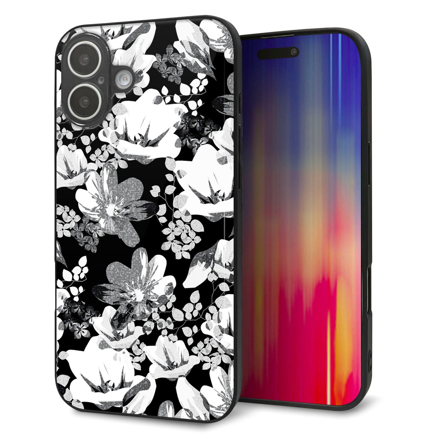 iPhone16 Plus 強化ガラス&TPUスマホケース ガラプリ【SC913 花柄モノトーン 02】