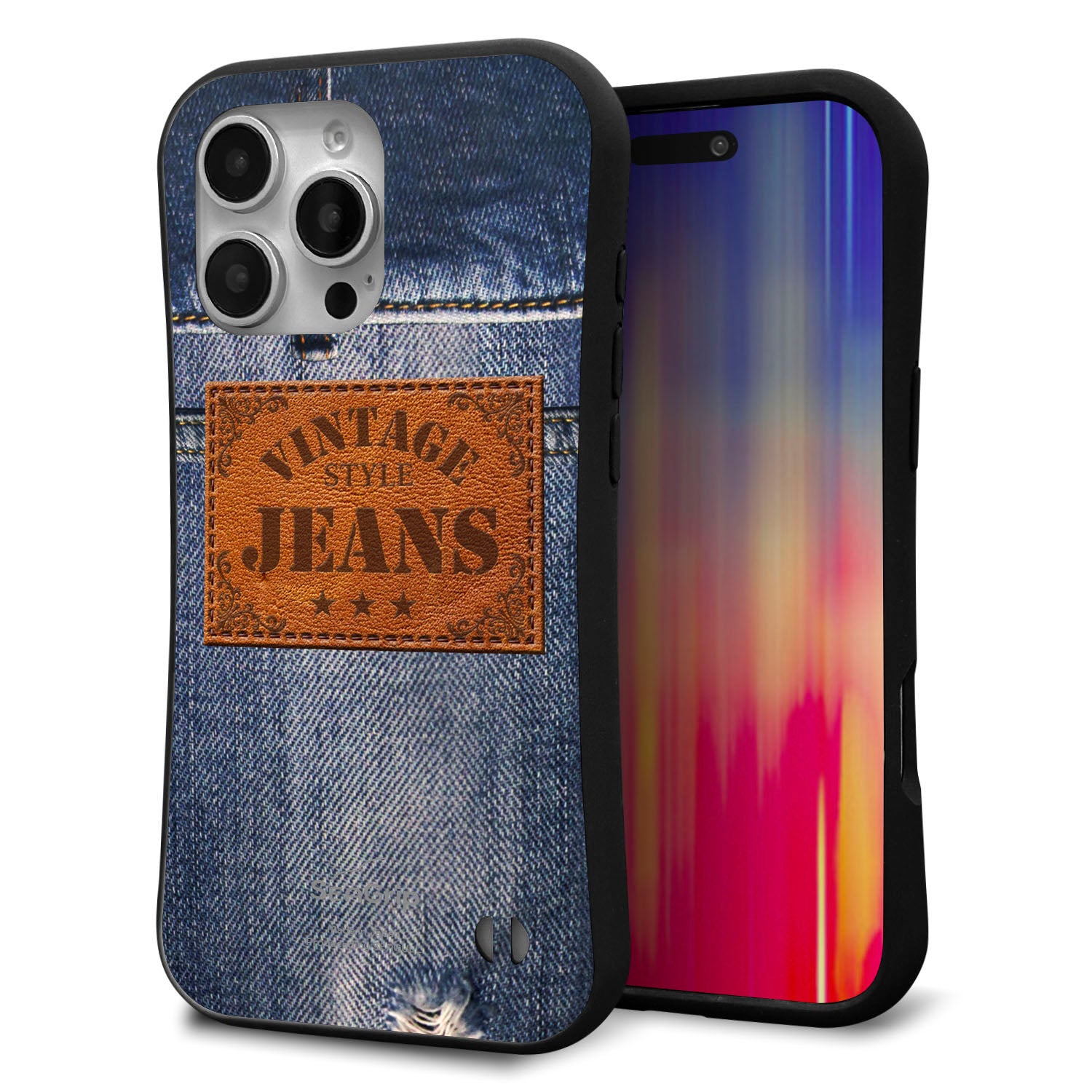 iPhone16 Pro Max スマホケース 「SEA Grip」 グリップケース Sライン 【SC921 ダメージデニム レザータグ】 UV印刷