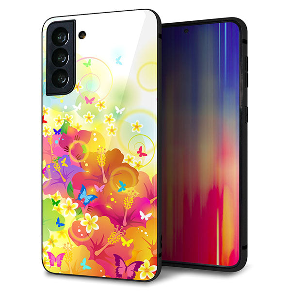 au ギャラクシーS21+ 5G SCG10 強化ガラス&TPUスマホケース ガラプリ【647 ハイビスカスと蝶】