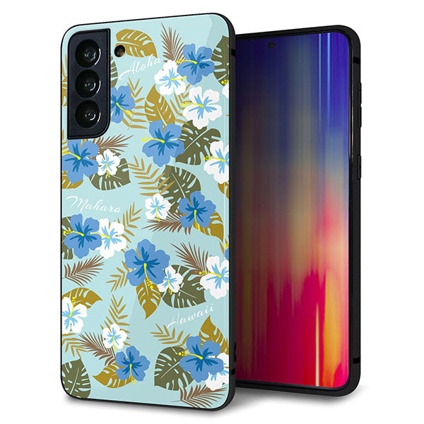 au ギャラクシーS21+ 5G SCG10 強化ガラス&TPUスマホケース ガラプリ【SC883 ハワイアンアロハレトロ(ブルー)】