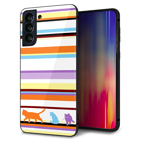 au ギャラクシーS21+ 5G SCG10 強化ガラス&TPUスマホケース ガラプリ【YA887 ストライプネコ01】