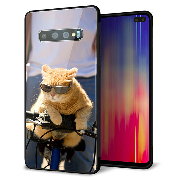 au ギャラクシー S10+ SCV42 強化ガラス&TPUスマホケース ガラプリ【595 にゃんとサイクル】