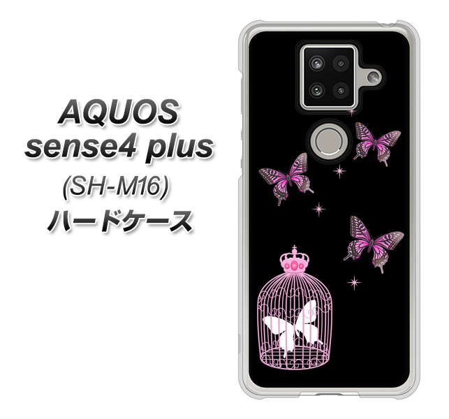 楽天モバイル アクオスセンス4 プラス SH-M16 高画質仕上げ 背面印刷 ハードケース【AG811 蝶の王冠鳥かご(黒×ピンク)】