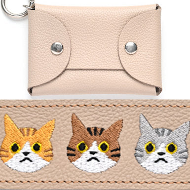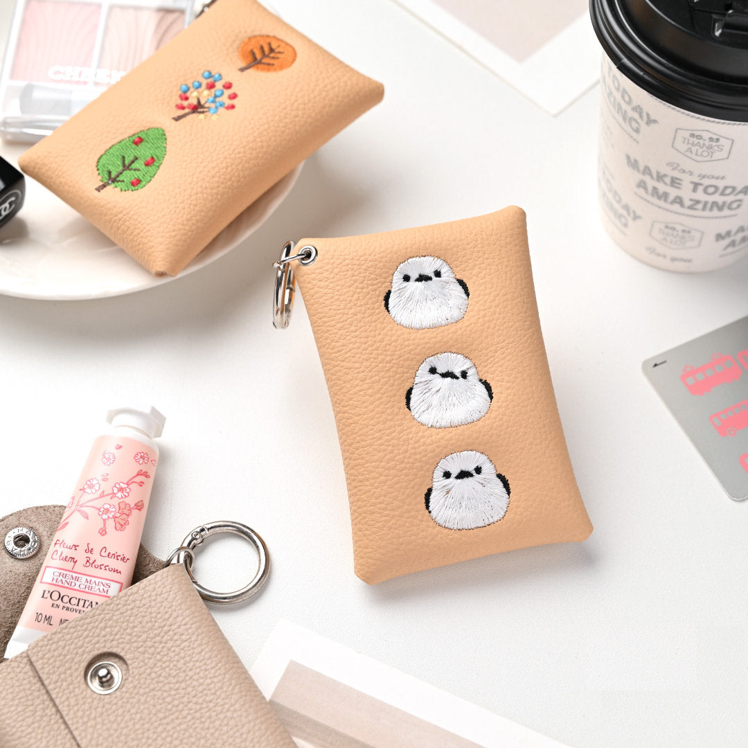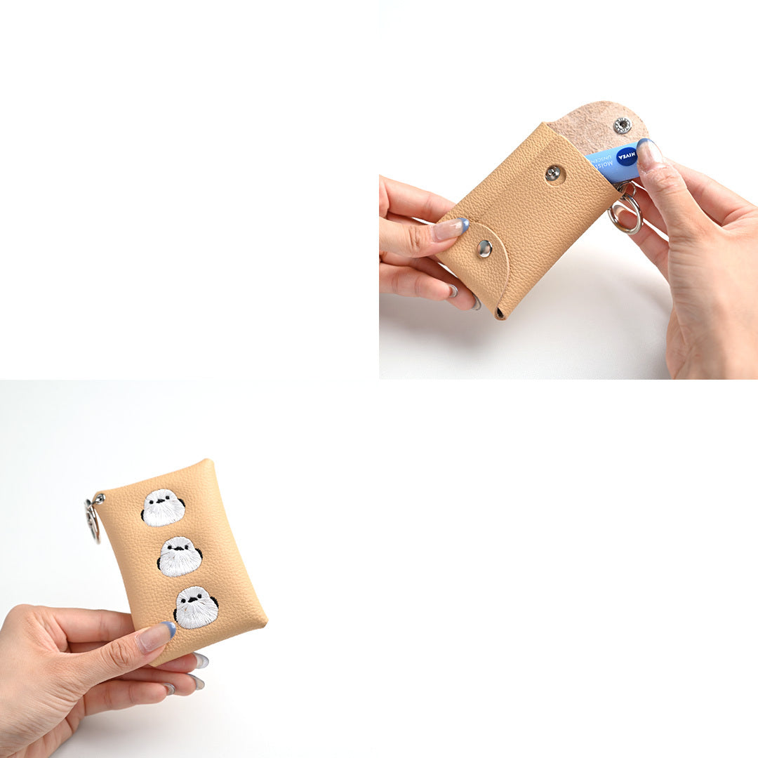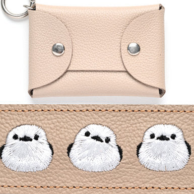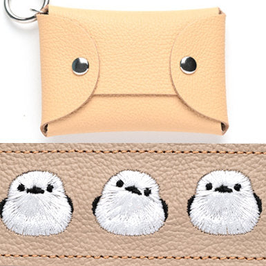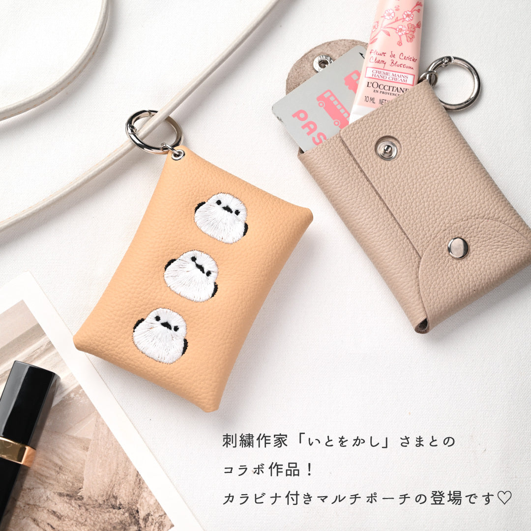 シマエナガとネコ マルチポーチ 【 シュリンクレザー 刺繍 】 カード収納 小物入れ